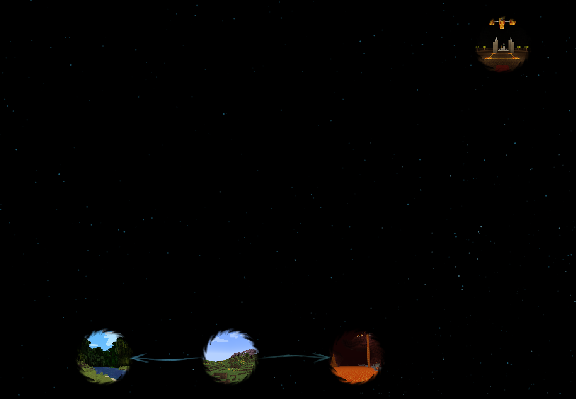The GUI takes the form of a window with a border, and inside the border is a map of multiple dimensions with arrows pointing from one dimension to another. The GUI opens centered on the Overworld, and the player can see the other dimensions by clicking and dragging the mouse around inside the window border. The player can zoom in and out using the scroll wheel.