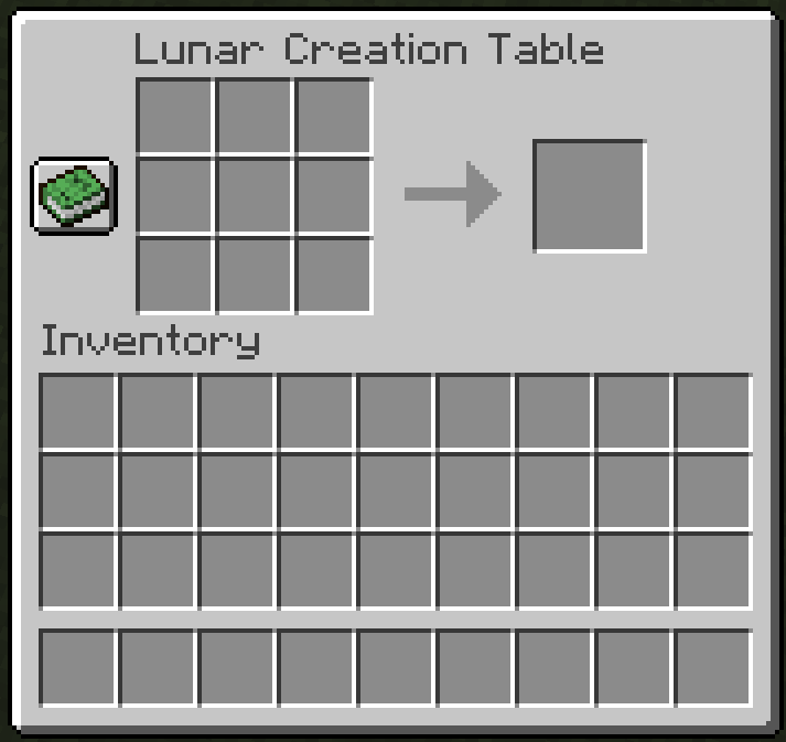 The Lunar Creation Table functions almost identically to a crafting table. The player can interact with the Lunar Creation Table to open its GUI. The GUI looks almost identical to the crafting table GUI, and has the exact same purpose. The recipe book is also present.