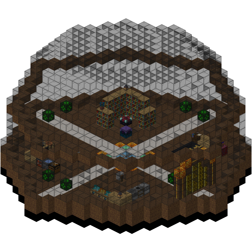 - A third quadrant has an Infusion Table, an Enchanting Table, and enough bookshelves surrounding the latter to get to level 30. There are also some decorations.