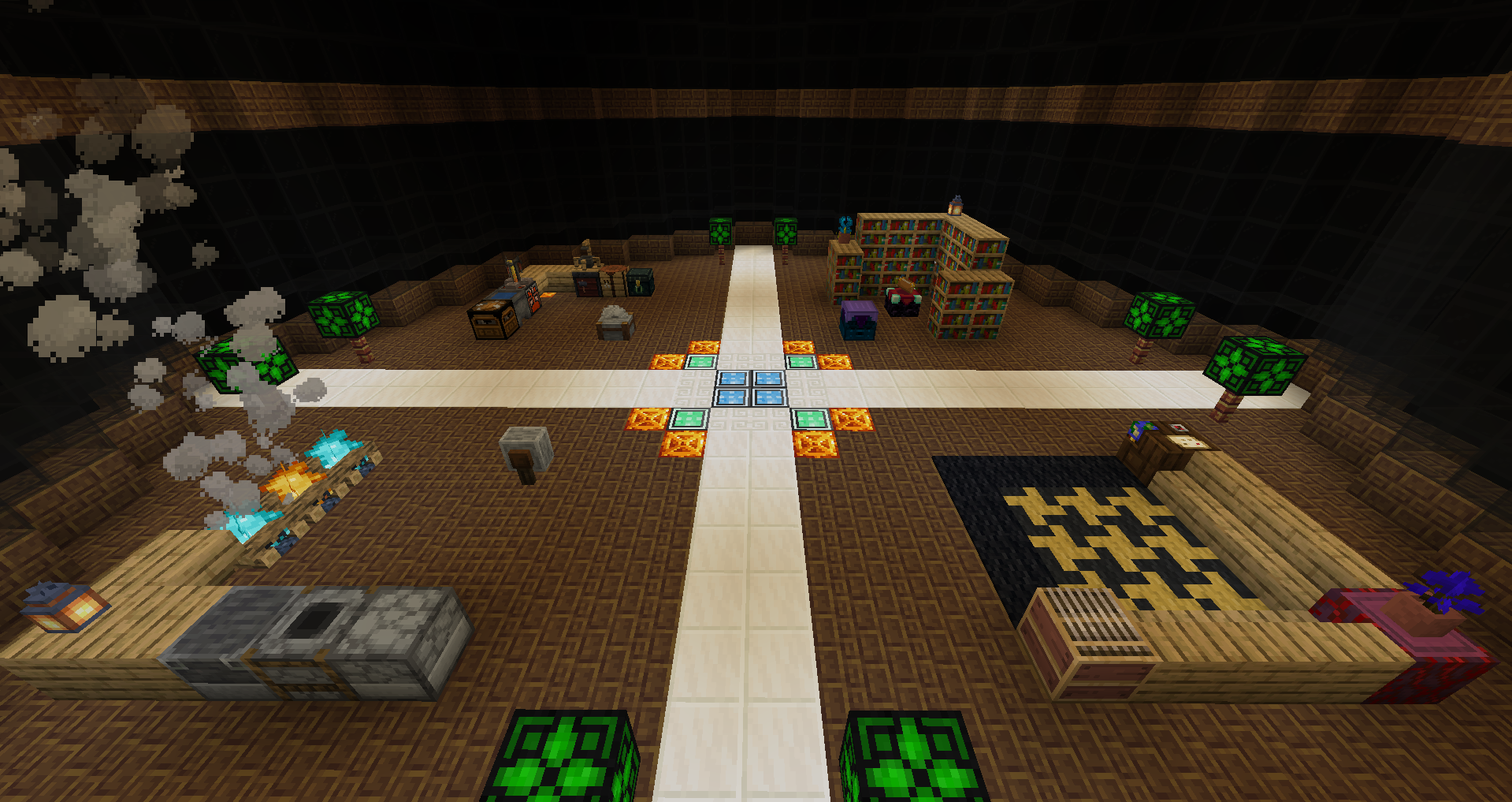 The quadrants are divided by walkways made of Blocks of Quartz. Other decorations exist in the room, such as lamps in the center of the floor, and Green Stained-Glass Lamps that exist around the four corners.