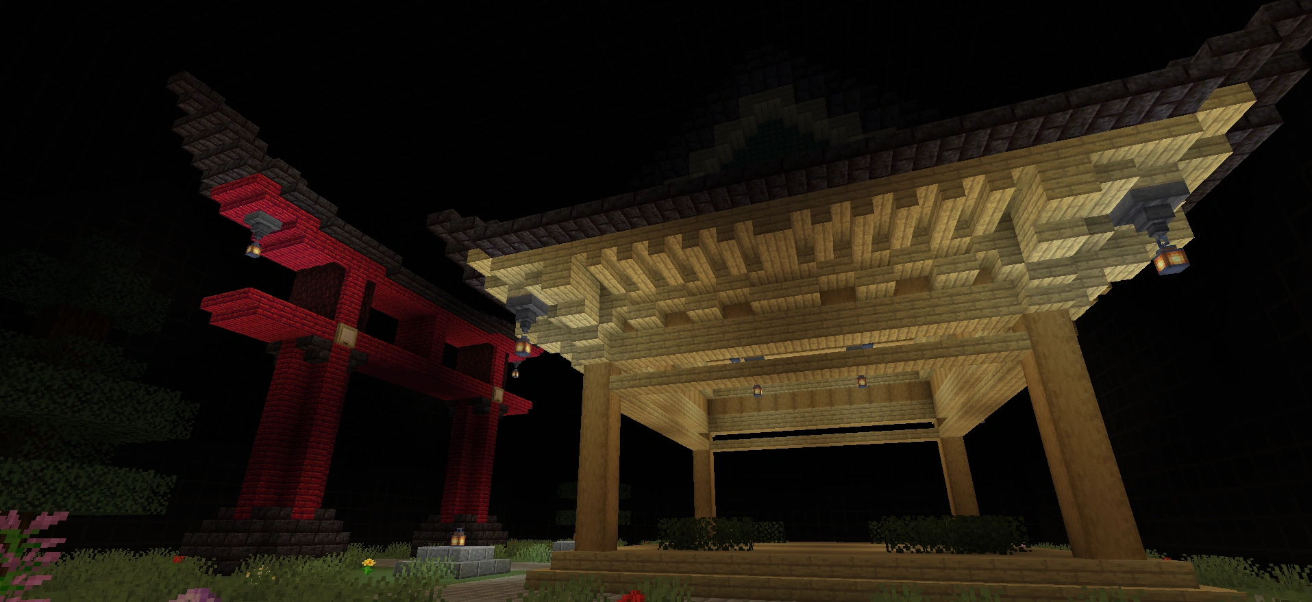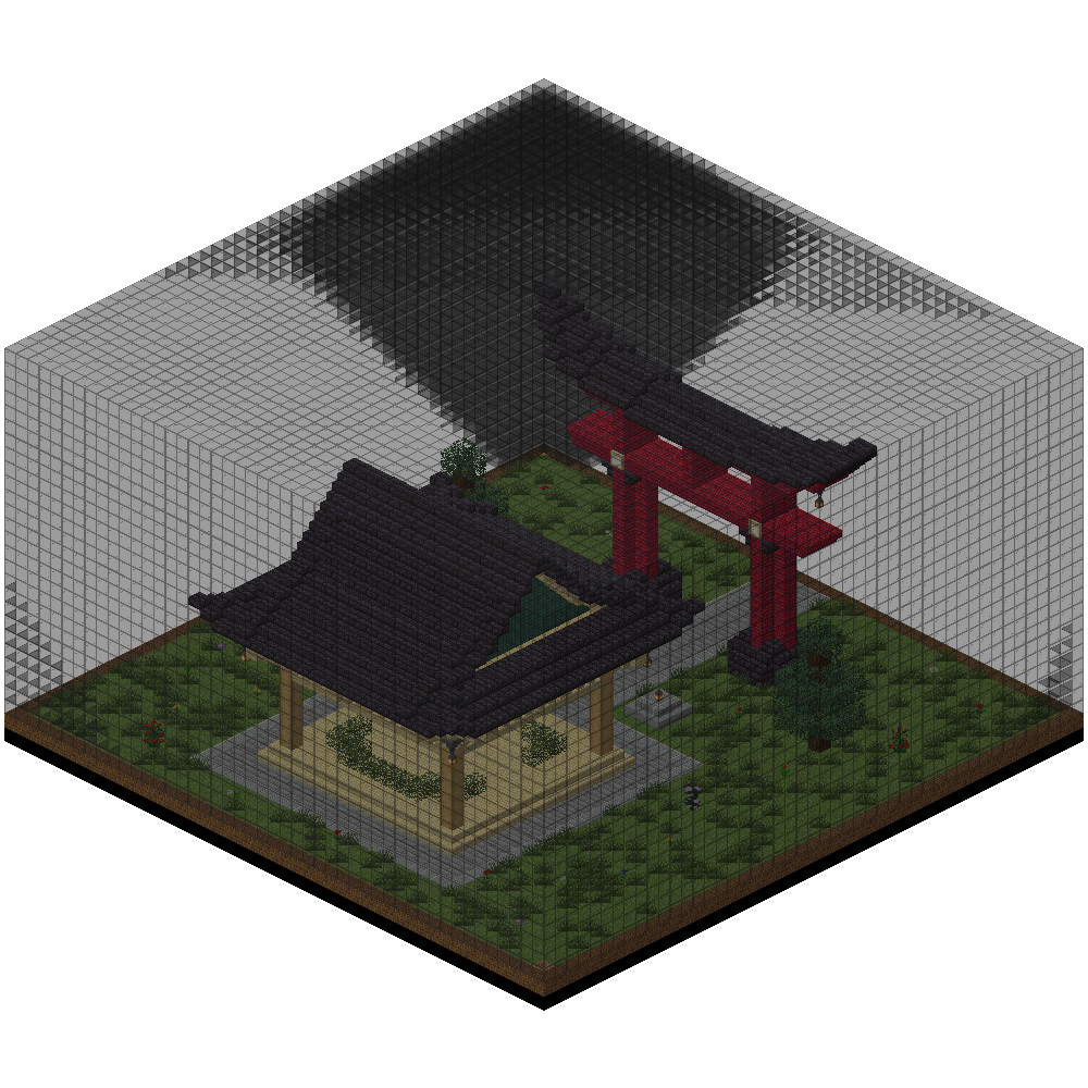 The Shrine Arena consists of two Japanese-style structures located in a sparsely-wooded meadow. The arena takes place inside a box made of Black Stained Glass, with a square of Dimensional Fabric underneath the floor.