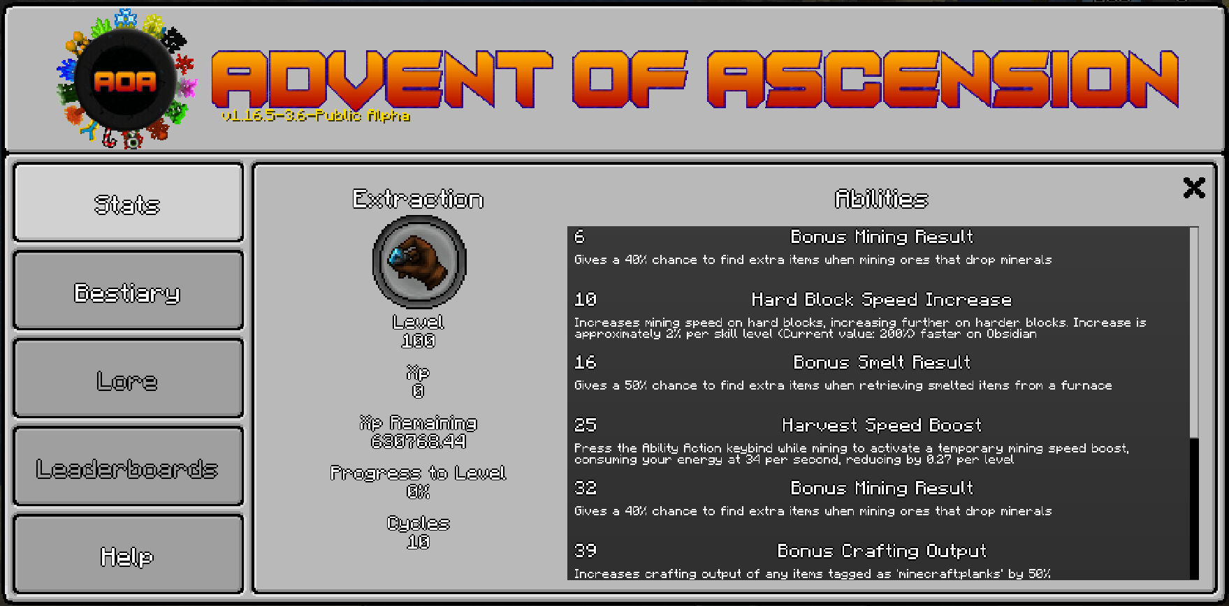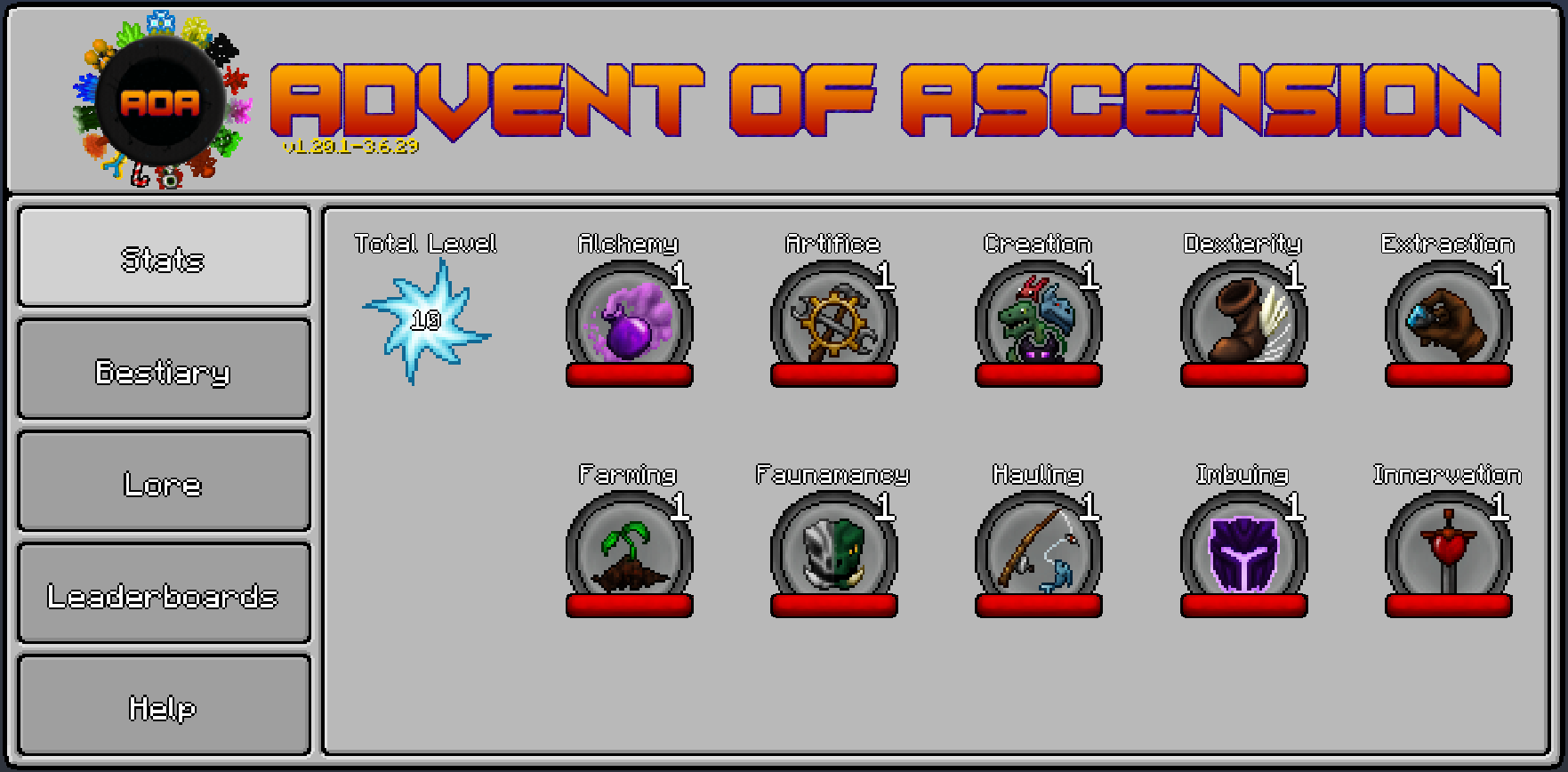 虚无世界GUI(Advent GUI)是本mod的信息中心,用于查看玩家的技能等级。